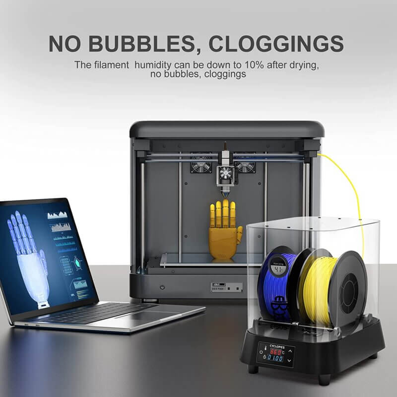 Real-time monitoring of the temperature in the box, keeping the temperature in the box constant by using the closed-loop intermittent heating mode. Hot air heating makes drying more efficient; the unique air duct design makes CYCLOPES conform to the principle of air thermodynamics, and the filament is heated more evenly.